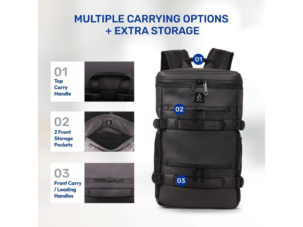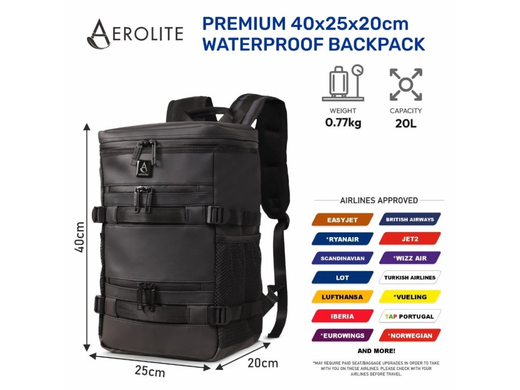 Batoh AEROLITE je vyroben z prémiové směsi polyesteru a PVC s pokročilým voděodolným povlakem a voděodolnými zipy, které pomáhají chránit Vaše oblečení, elektroniku i cestovní nezbytnosti před deštěm, postříkáním a náhodným politím. Rozměry 40 × 20 × 25 cm a objem přibližně 20 l odpovídají kategorii podsedadlového kabinového zavazadla, které je u většiny leteckých společností – včetně nízkonákladových dopravců jako Ryanair a Wizz Air – přepravováno bez příplatku. Batoh nabízí polstrované pouzdro na notebook do 14″, několik praktických kapes a přehledné vnitřní uspořádání.
