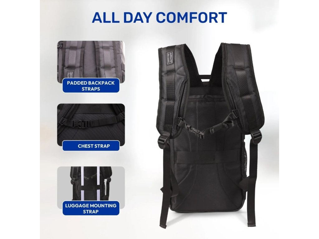 Vzhled je střídmý a funkční, navržený pro každodenní přesuny mezi městem a letištěm. Materiál s voděodolnou úpravou si zachovává pevnost i při častém používání a pomáhá udržet obsah v suchu při proměnlivém počasí. Batoh lze ideálně kombinovat s kufrem ve stejném designu a kvalitě o rozměrech 55 × 40 × 20 cm, takže můžete sladit výbavu pro hlavní i druhé kabinové zavazadlo.