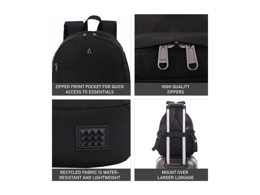 Batoh má jeden hlavní prostor, na přední straně menší kapsu a na bocích jsou kapsičky ze síťoviny. Uvnitř batohu je polstrovaný prostor pro notebook a organizér. Pohodlné nastavitelné ramenní popruhy v kombinaci s polstrovanými zády zajišťují maximální pohodlí při nošení. Batoh je vybaven speciálním popruhem na zadní straně, díky němuž ho můžete připevnit přes výsuvné madlo kufru. Batoh je trvale udržitelný, protože vnější materiál je vyroben z recyklovaných plastových lahví, což pomáhá životnímu prostředí a zároveň přeměňuje odpad na výrobky, ze kterých můžete mít dobrý pocit. Na batoh se vztahuje 10-ti letá záruka, která se vztahuje na všechny výrobní vady, abyste měli naprostý klid. Tento batoh má maximální rozměry 40 x 30 x 10 cm, takže si ho můžete vzít zdarma do kabiny při letu s těmito leteckými společnostmi - LUFTHANSA, SWISS a AUSTRIAN AIRLINES. Jako příruční zavazadlo ji přijímá i několik dalších významných leteckých společností po celém světě: EasyJet, Ryanair, Finnair, Iberia, Pegasus, skandinávské SAS, TAP Portugal, Turkish Airlines a mnoho dalších!