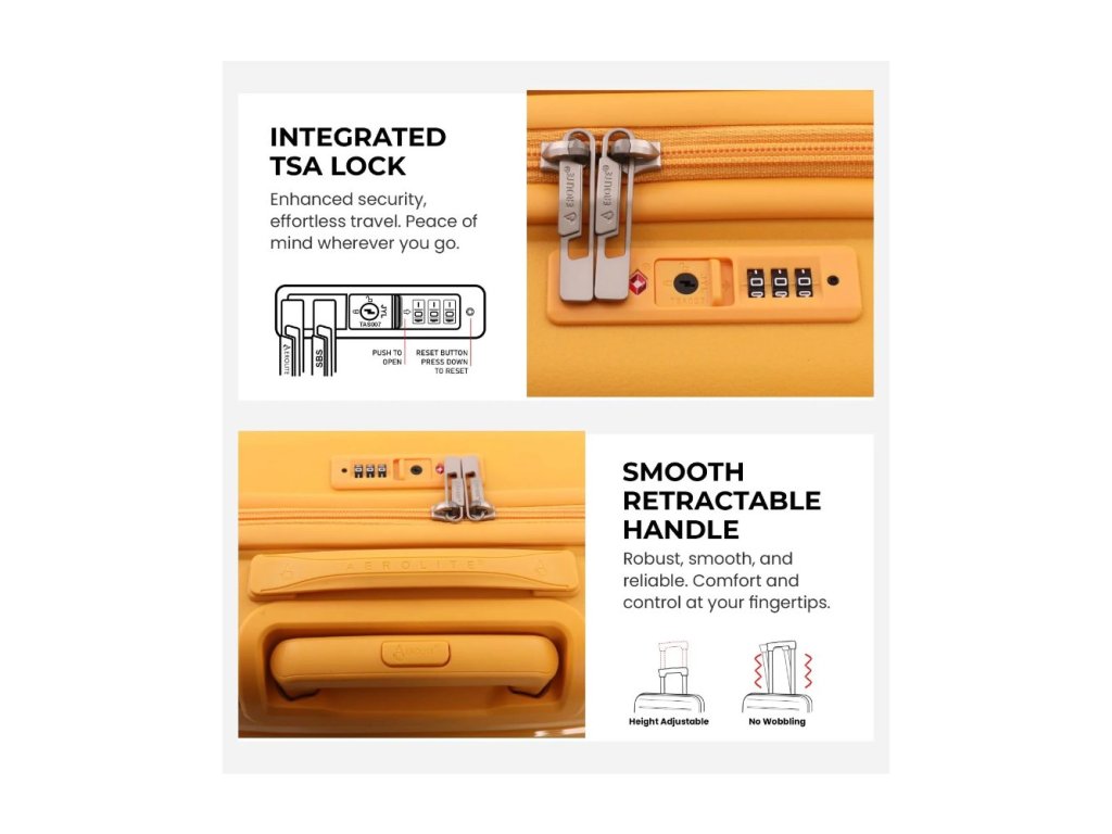 Cestovní kufr Aerolite 155 velikosti S je vyroben z ultralehkého a odolného polypropylenu (PP), který vyniká vysokou odolností proti nárazu a dlouhou životností i při častém cestování. Kufr je vybaven integrovaným TSA zámkem, který zajišťuje bezpečné uzamčení obsahu a bezproblémové letištní kontroly.