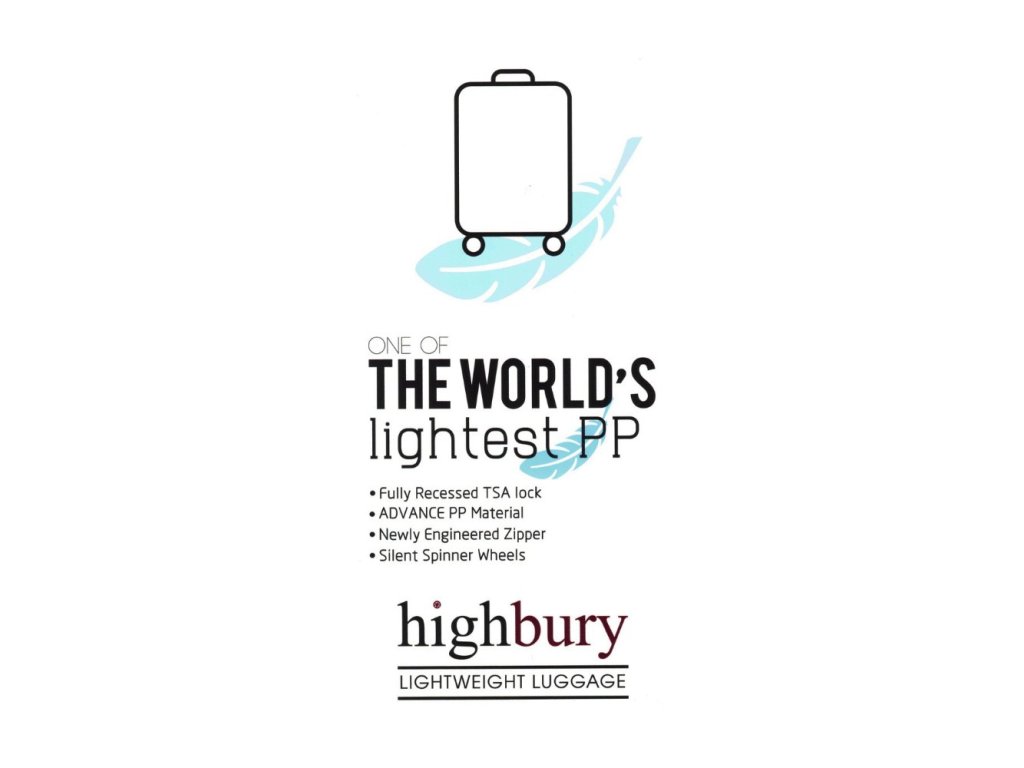 Cestovní kufr z kolekce HIGHBURY Helios je vyroben z extrémně pevného polypropylenu, který je pevný a odolný proti nárazu.Kufr je uzavíratelný zipem, oba jezdce zipu se dají zapojit do TSA zapuštěného kódového zámku. Horní madlo je plastové. Má lehký teleskopický výsuvný systém, prostor na víku oddělený textilní přepážkou, vnitřní kapsy a jistící popruhy.Celý pojízdný systém je umístěn uvnitř kufru pod textilní podšívkou, aby nedošlo k poškození systému při přepravě a je opatřen čtyřmi dvojitými kolečky otočnými o 360°.Tato velikost kufru je většinou leteckých společností akceptována jako kabinové zavazadlo (např. Easyjet, British Airways).Cena je uvedena za 1ks zobrazené velikosti S.