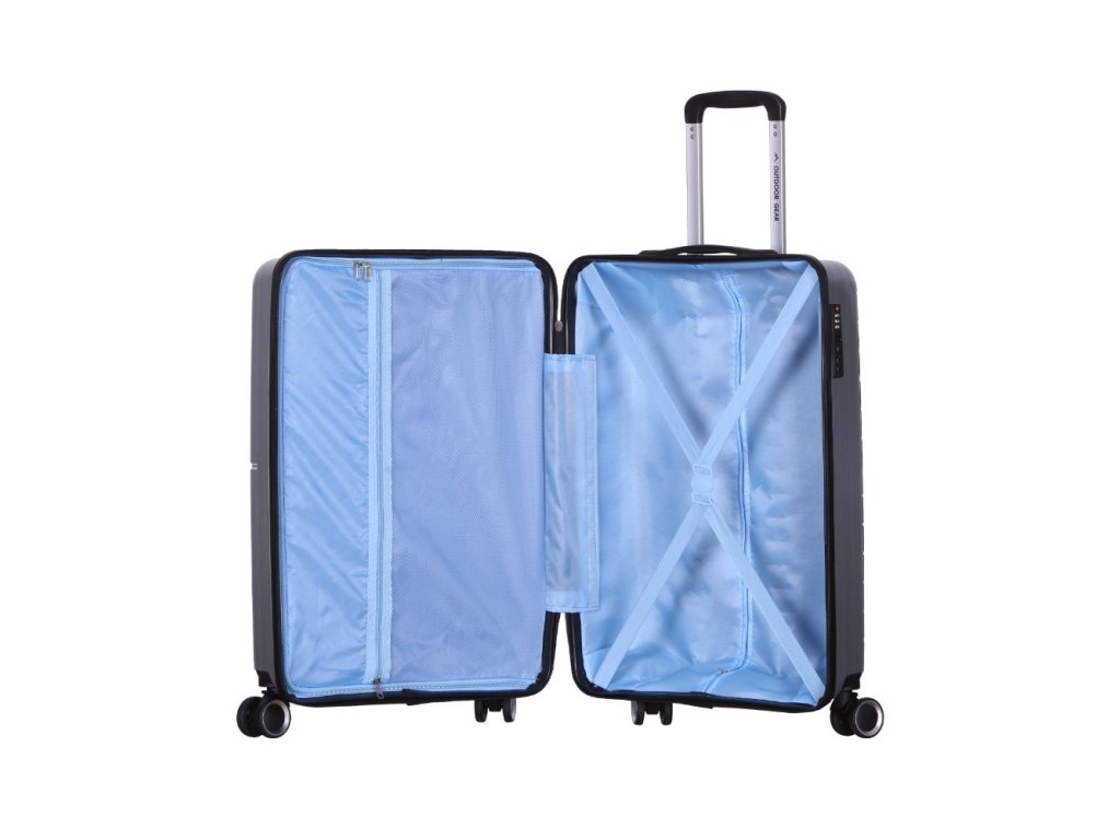 Kufr je uzavíratelný zipem, oba jezdce zipu se dají zapojit do TSA zapuštěného kódového zámku. Horní madlo je plastové. Tato velikost kufru nemá boční madlo. Má lehký teleskopický výsuvný systém, prostor na víku oddělený textilní přepážkou, vnitřní kapsu a jistící popruhy.