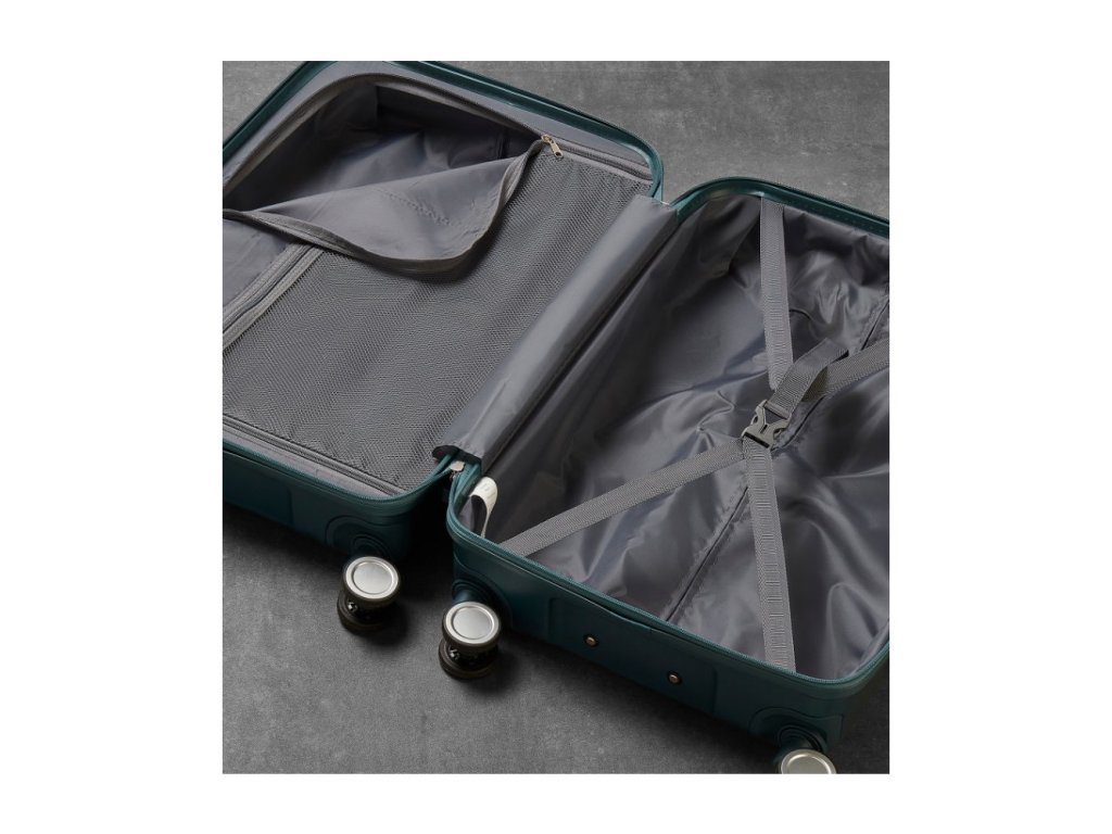 Kufr je uzavíratelný zipem. Oba jezdce zipu mají očko pro pohodlné nasazení kódového nebo klíčového zámku. Horní madlo je plastové. Má lehký teleskopický výsuvný systém, prostor na víku oddělený textilní přepážkou, vnitřní kapsu a jistící popruhy.
