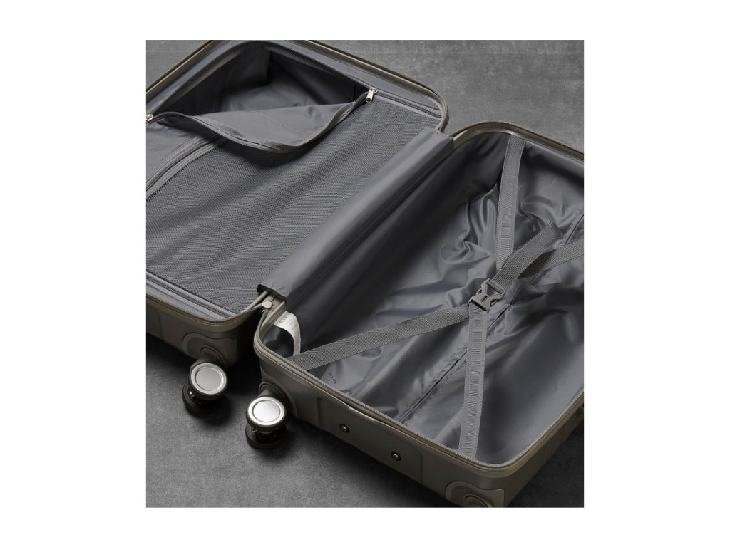 Kufr je uzavíratelný zipem. Oba jezdce zipu mají očko pro pohodlné nasazení kódového nebo klíčového zámku. Horní madlo je plastové. Má lehký teleskopický výsuvný systém, prostor na víku oddělený textilní přepážkou, vnitřní kapsu a jistící popruhy.