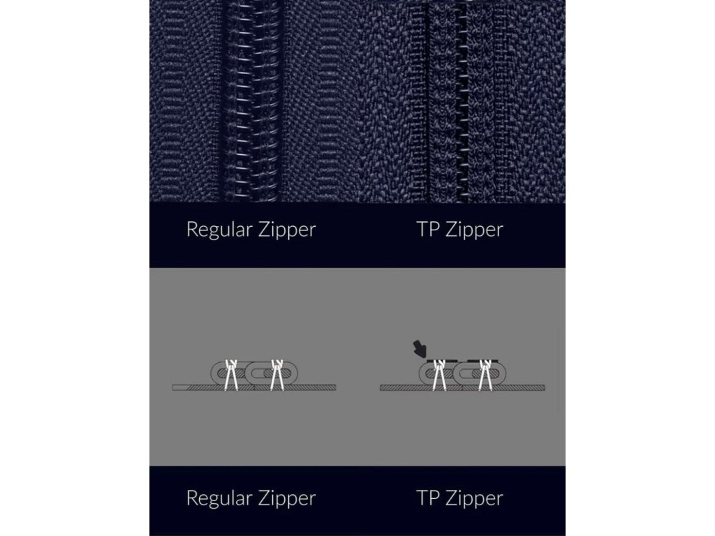 Skutečná kvalita se však skrývá v detailech – inovativní zip s ochranou zubů (TP) má speciální ochrannou vrstvu, která brání vniknutí prachu, písku nebo drobných kamínků, což bývá častý problém při častém cestování. Díky této technologii se zip i po letech plynule otevírá a zavírá i po mnoha letech intenzivního používání.