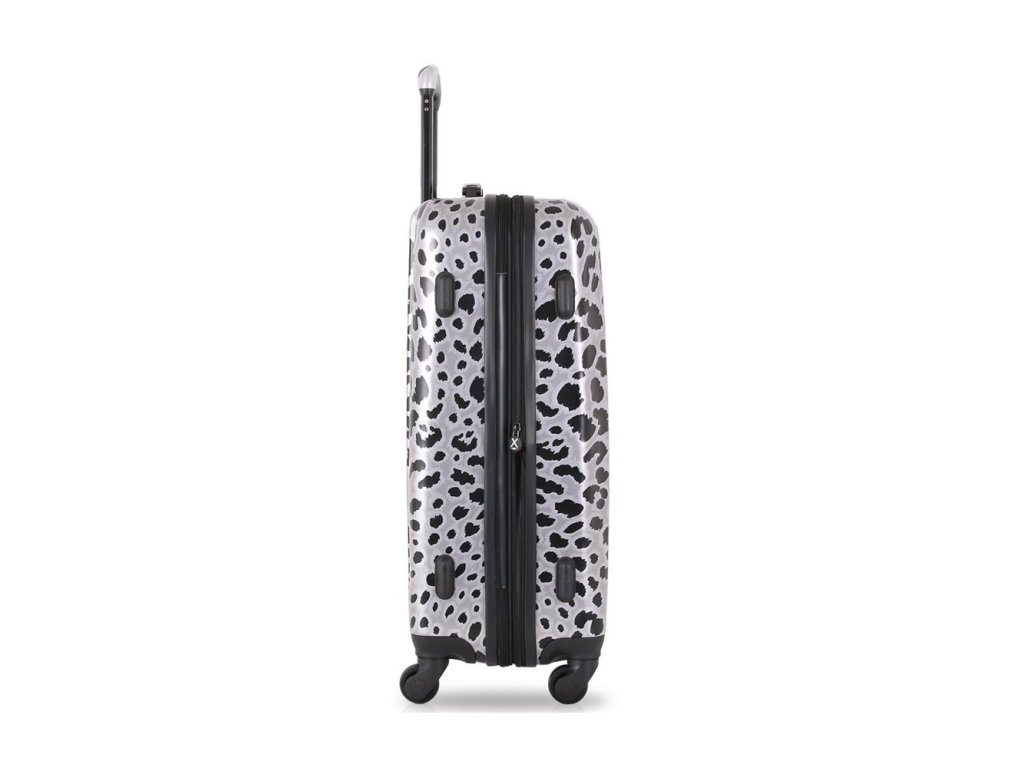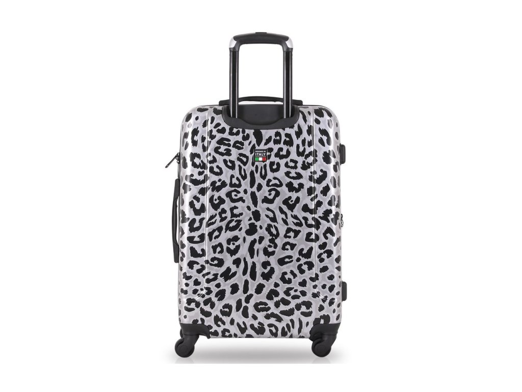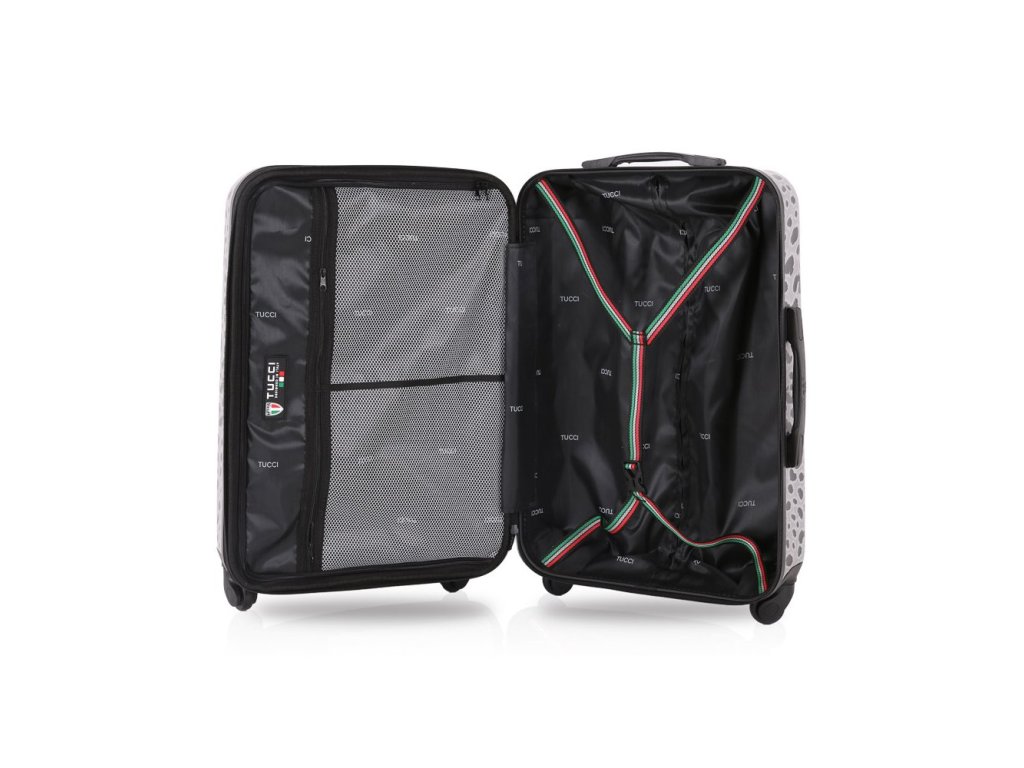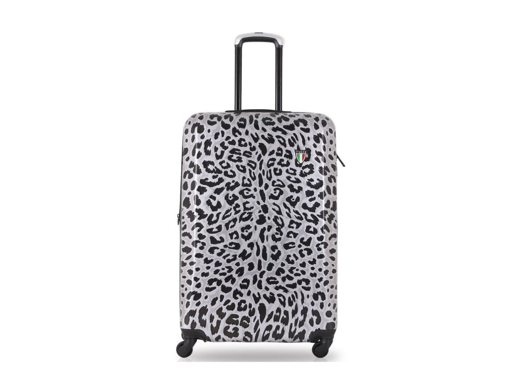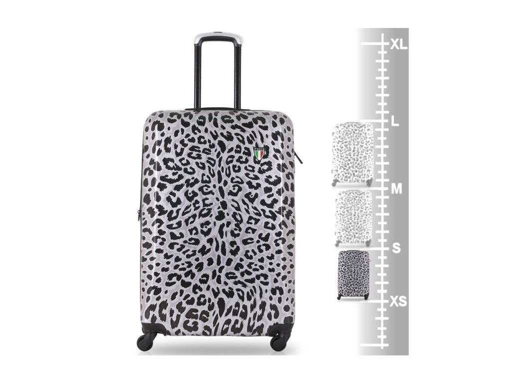Cestovní kufr z kolekce TUCCI Winter Leopard.Tato jedinečná kolekce Winter Leopard byla vyrobena spojením technologie, umění a vysoce kvalitních materiálů.Kufr je uzavíratelný zipem. Oba jezdce zipu mají očka pro pohodlné nasazení kódového nebo klíčového zámku. Horní madlo je plastové. Tato velikost kufru nemá boční madlo. Má lehký teleskopický výsuvný systém, prostor na víku a vnitřní kapsy.Celý pojízdný systém je umístěn uvnitř kufru pod textilní podšívkou, aby nedošlo k poškození systému při přepravě a je opatřen čtyřmi kolečky otočnými o 360°.