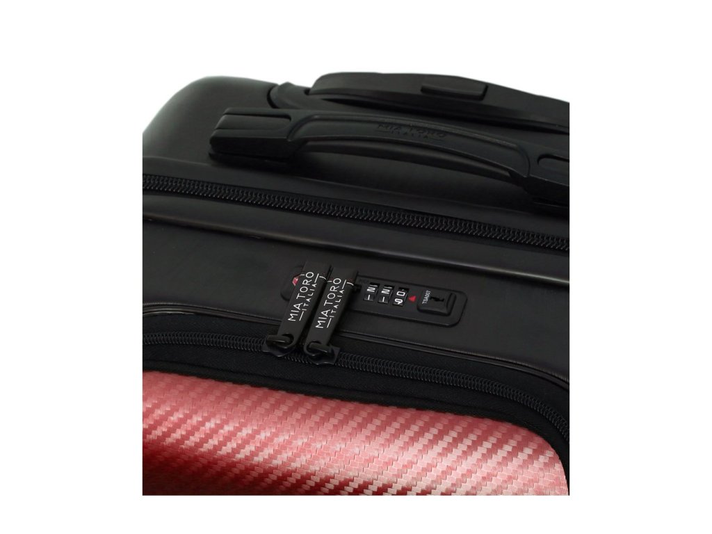 Cestovní kufry z kolekce MIA TORO Carbonio Superior.Kufry Carbonio Superior mají elegantní nadčasový design karbonu. Kolekce byla navržena v Itálii, kombinuje nejvyšší kvalitu, funkce a design pro moderní cestovatele.Kufry jsou uzavíratelné zipem. Oba jezdce zipu se dají zapojit do TSA zapuštěného kódového zámku. U kufrů lze pomocí druhého zipu zvětšit vnitřní objem. Horní i boční madla jsou plastová. Mají lehký (teleskopický u velikosti S)výsuvný systém, textilní přepážku s kapsami a jistící popruhy.Celý pojízdný systém je umístěn uvnitř kufru pod textilní podšívkou, aby nedošlo k poškození systému při přepravě a je opatřen čtyřmi dvojitými kolečky otočnými o 360°.